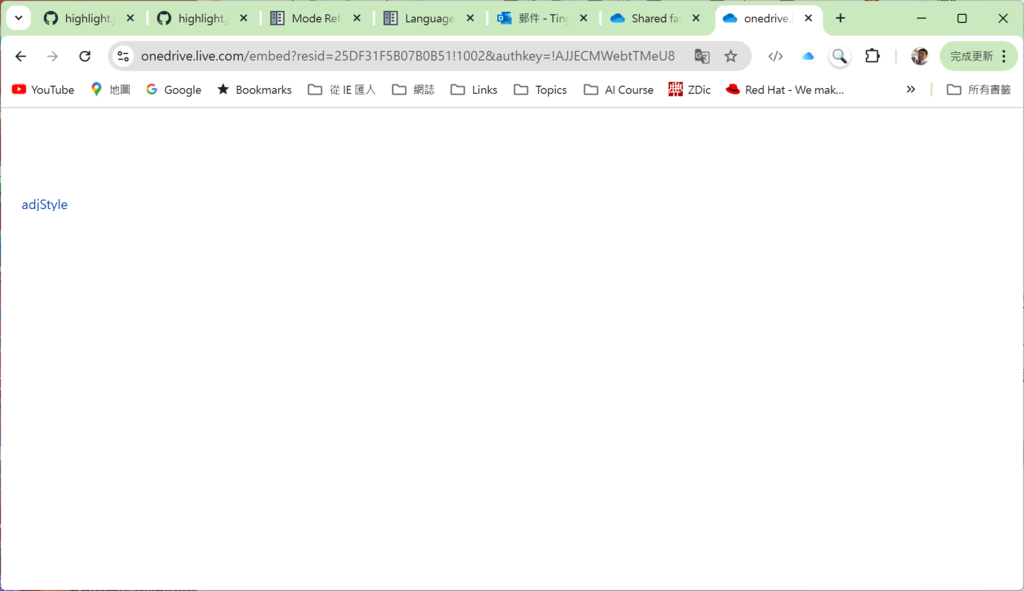 在此我們需要取出新版本 <iframe> URL 並貼在 browser 上方的 URL 輸入框內並按下 Enter 鍵. 此時, 頁面會轉到一個幾乎是空白的頁面, 內容只有分享檔案的檔名. 此時 browser 上方的 URL 輸入框內即是我們要的 URL: 一個類似原版本 <iframe> URL.